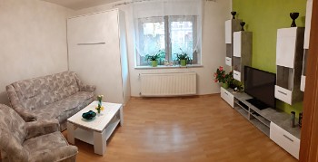 In dem Zimmer befinden sich eine moderne Anbauwand, ein großer 3D Fernseher, ein 2-Sitzer, ein Sessel, Couchtisch, sowie ein Bettschrank. Der Bettschrank ist 1,60m x 2m groß und ist für 2 weitere Schlafplätze geeignet.